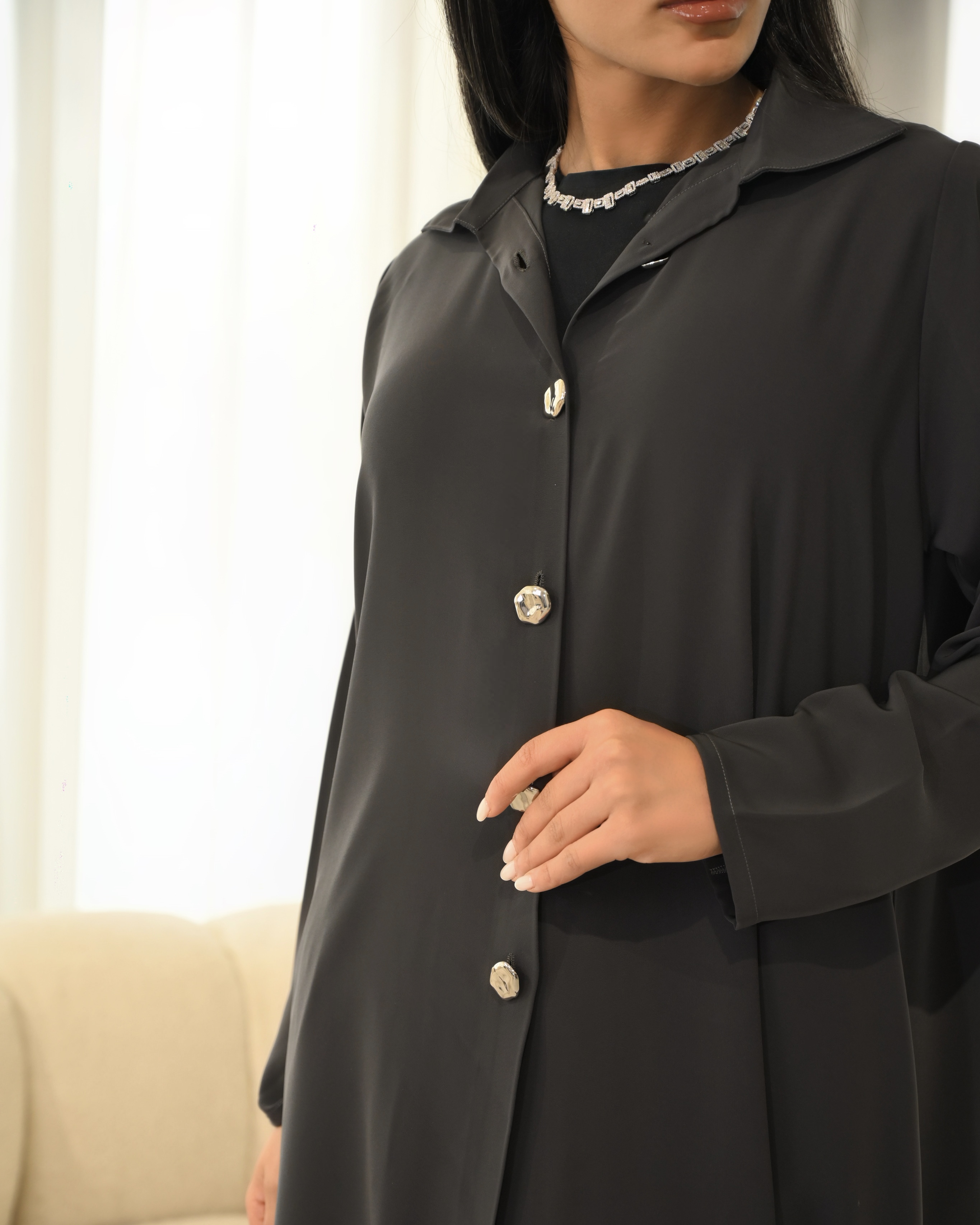 The Blair Code Abaya made from premium Victoria fabric, this abaya combines modern elegance with a structured design. Featuring gold buttons and a two-tone maroon and black sheila, it offers a refined, luxurious look for every occasion.